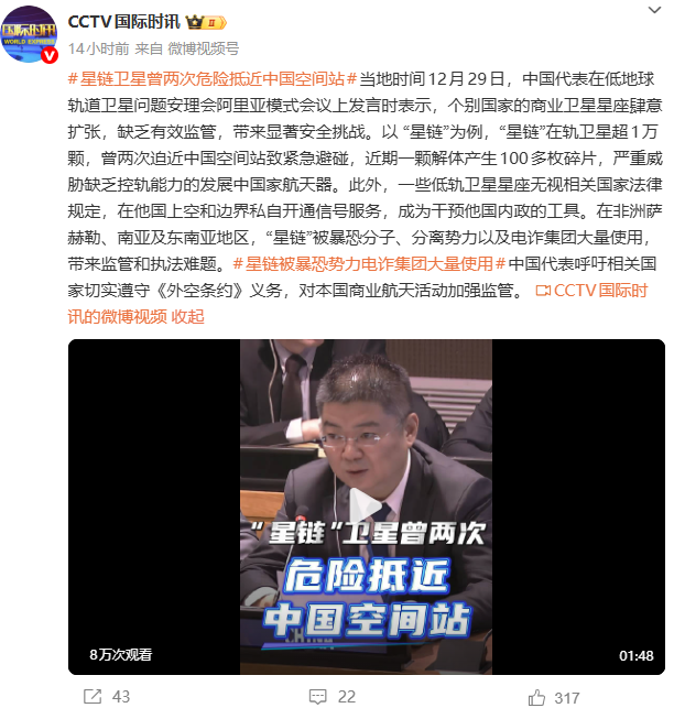 星链被暴恐势力电诈集团大量使用,中国代表呼吁相关国家切实遵守《外空条约》义务,对本国商业航天活动加强监管。(CCTV国际时讯微博)